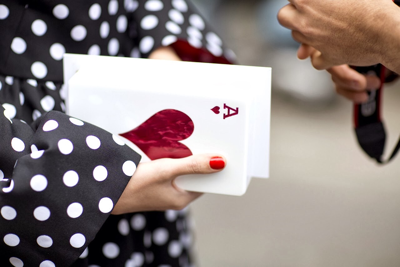 撲克牌造型的手拿包小巧而精致,有點(diǎn)古靈精怪,仿佛人群里妙趣橫生的魔術(shù)師,下一秒鐘就從手拿包里變出一只玫瑰。也別以為撲克牌手拿包只有搞怪,一樣能打造出堪比明星的時(shí)尚感。